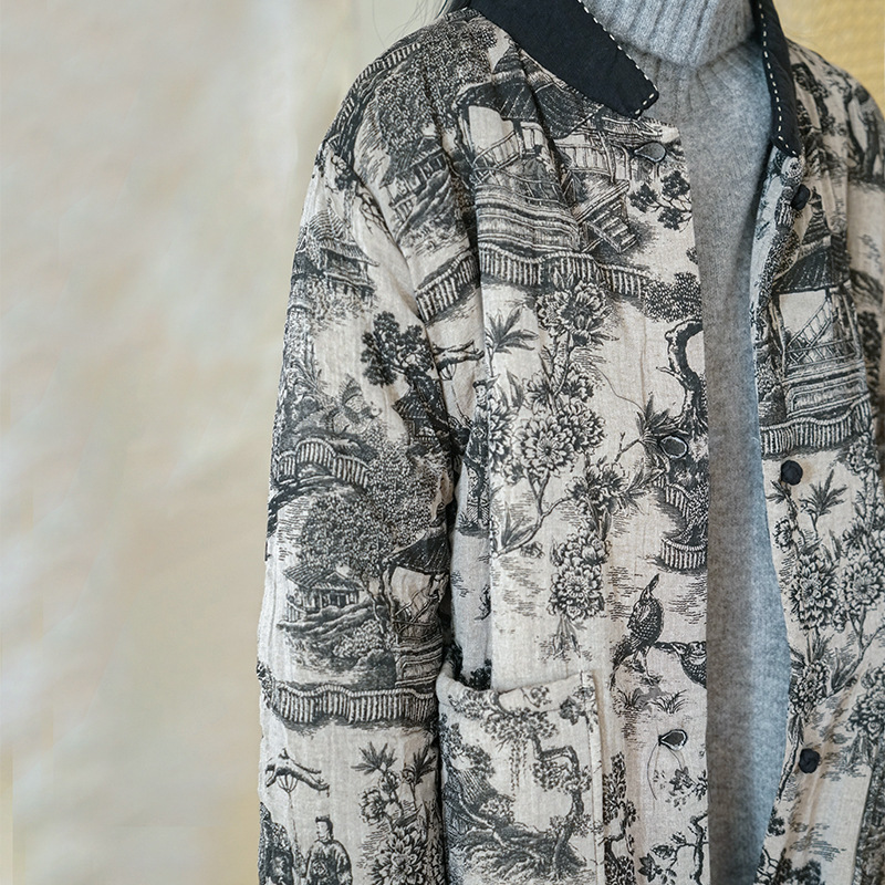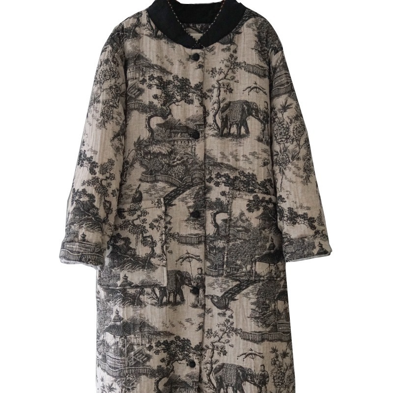 الأصلي الرجعية طبقة مزدوجة الطباعة مبطن مزدوجة الصدر الأزياء الوطنية معطف مبطن بالقطن النمط الصيني الجديد فريد معطف طويل مبطن بالقطن M21468