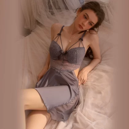 | nameOriginal | Pajamas, feminine and high-end, summer ice silk lace backless straps, breast pads, nightgown, long-sleeved two-piece set, thin style |