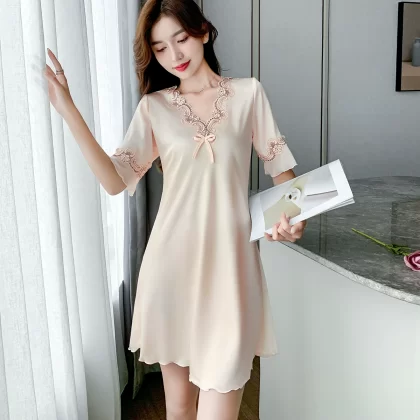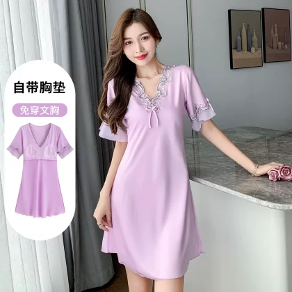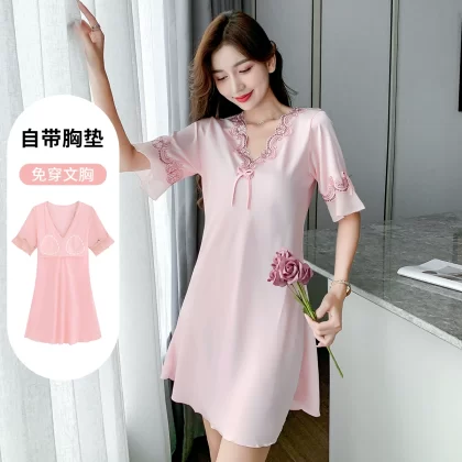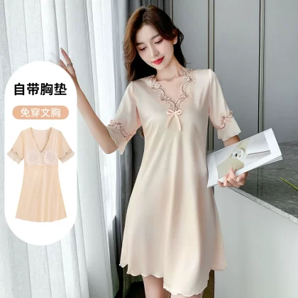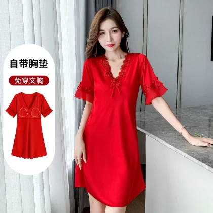 | nameOriginal | Pajamas for women summer ice silk sexy belted breast pad nightgown short-sleeved Internet celebrity style silk summer high-end home wear |