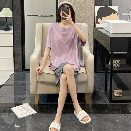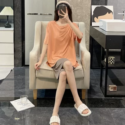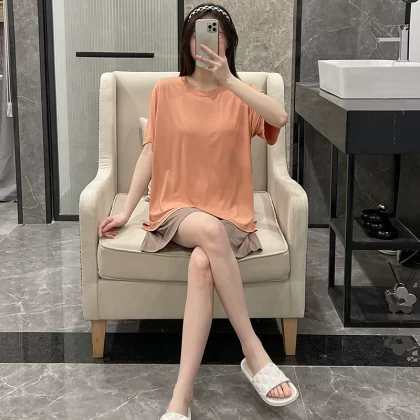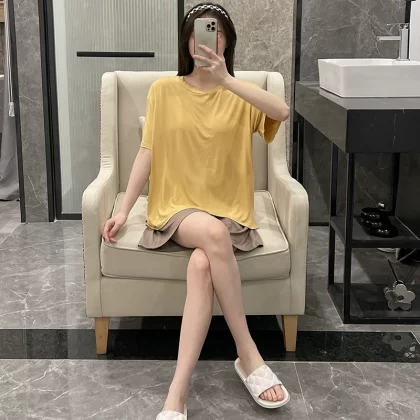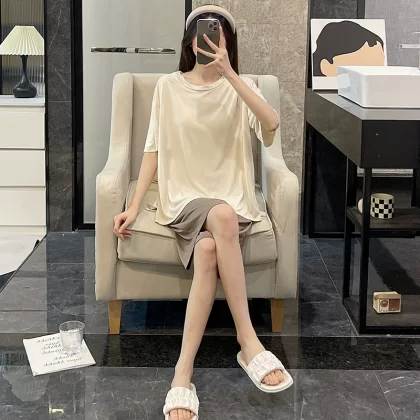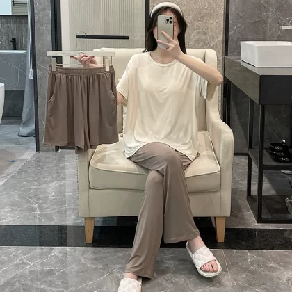 | nameOriginal | Pajamas for women summer short-sleeved modal cool ice silk three-piece suit with chest pad brown and white spring and autumn large size home clothes |