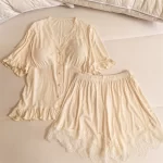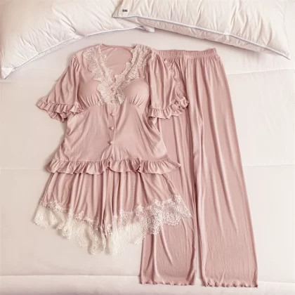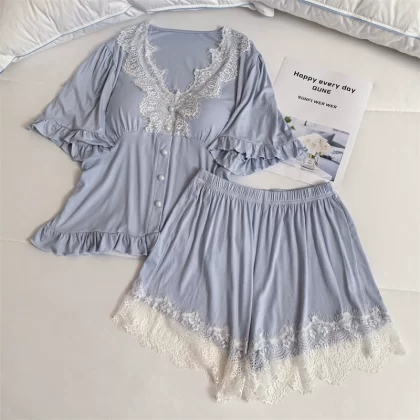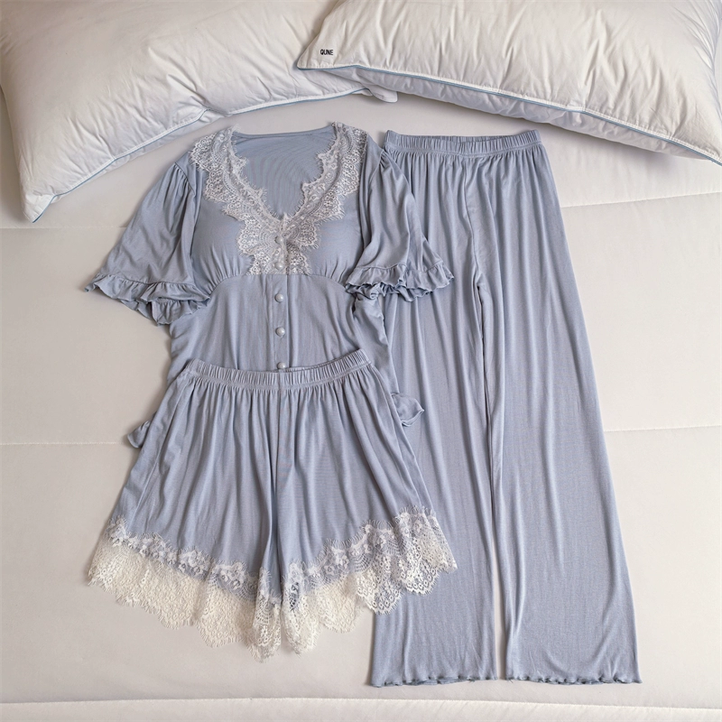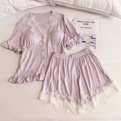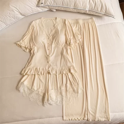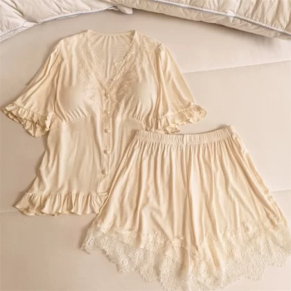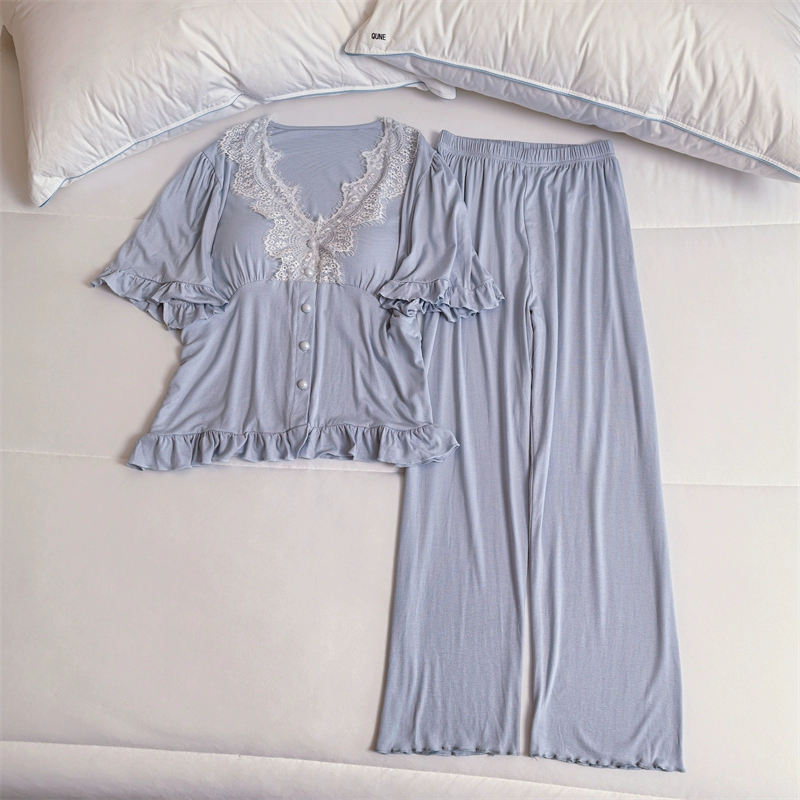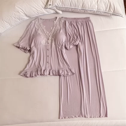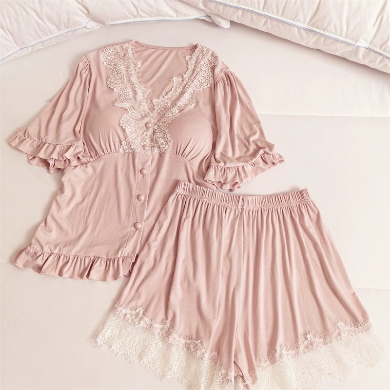 Pajamas with breast pads for women spring and summer modal short-sleeved cardigan two-piece set new high-end pure lust style home clothes