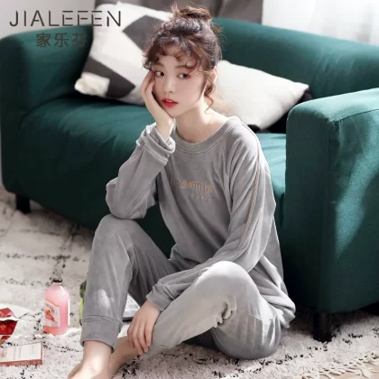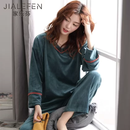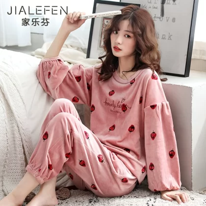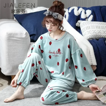 بيجامة نسائية للخريف والشتاء ملابس منزلية من الفلانيل المرجاني المخملي بالإضافة إلى مخمل دافئ وسميك للربيع والخريف مخمل جزيرة رقيق