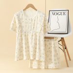 بيجامة نسائية صيفية قصيرة الأكمام شورت قطن طبقة مزدوجة شاش ملابس منزلية نسائية حلوة طقم بيجامات قطن فضفاض مجموعة