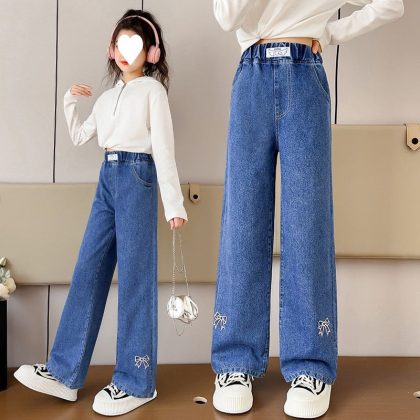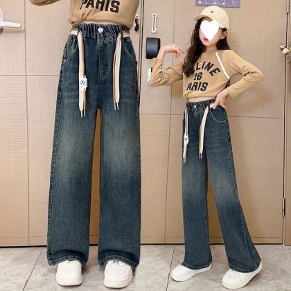 | nameOriginal | Pants Denim girls fleece-lined autumn and winter wide leg 2023 new medium and big children versatile slimming thick straight wholesale |