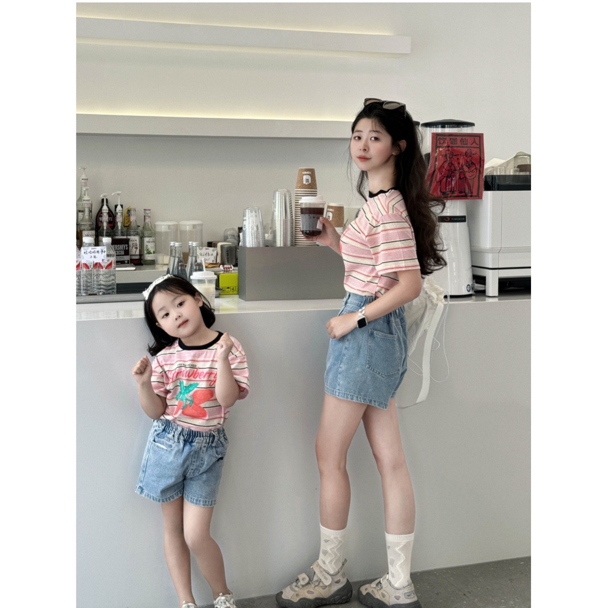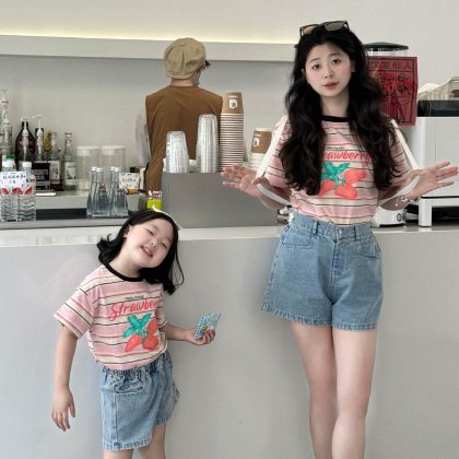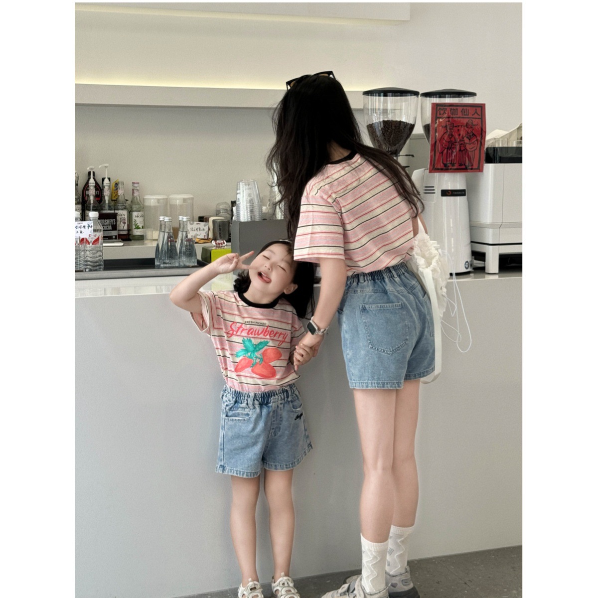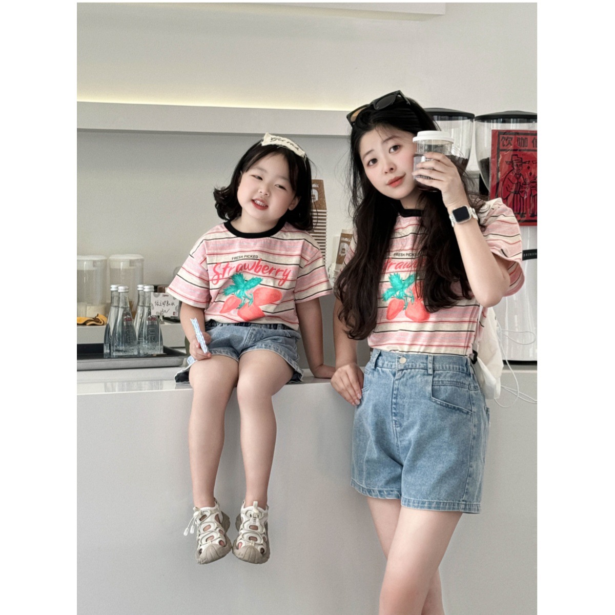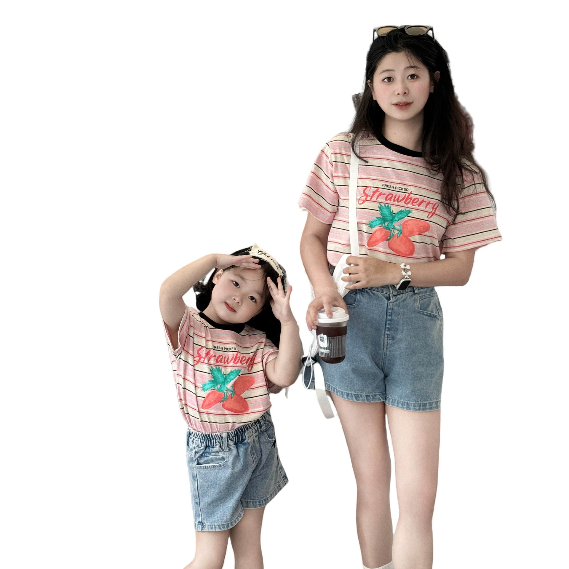 Parin-child Summer New Printed Strawberry T-shirt Mother and Women's Striped Short-sleeved Top Class A Cotton T-shirt Family Short-sleeved