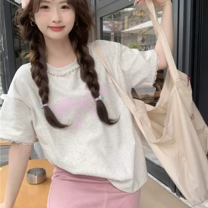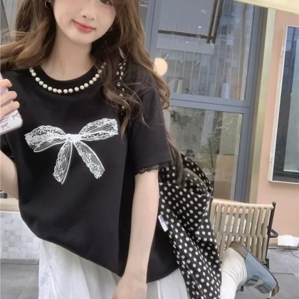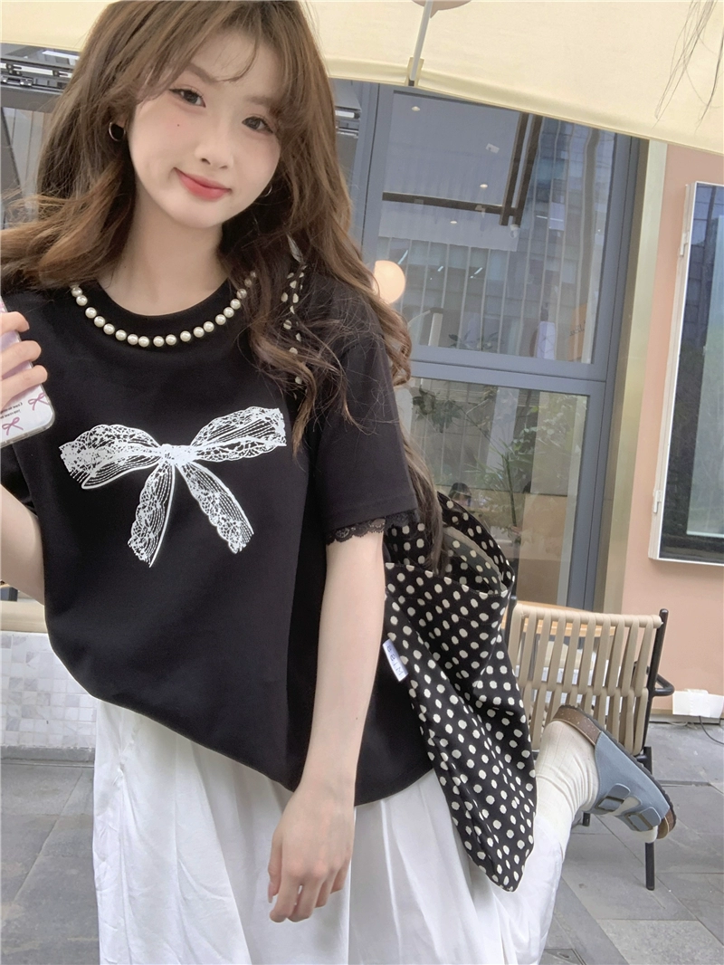 Pearl casual black printed lace short-sleeved top