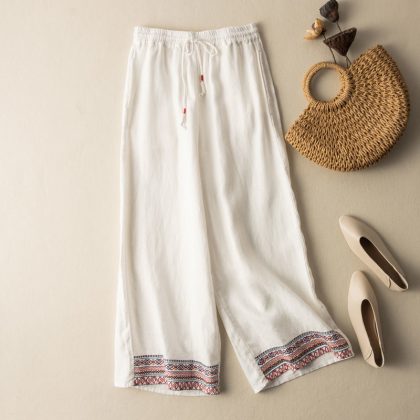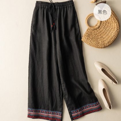 قلادة من القطن والكتان مطرزة واسعة الساق السراويل النسائية 2023 صيف جديد فضفاض مستقيم السراويل كل مباراة عالية الخصر التخسيس سراويل تقليدية