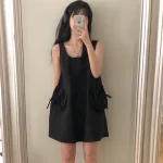 | nameOriginal | Pig Ernie Korean Dongdaemun summer retro U-neck loose versatile vest dress sleeveless big pocket dress |