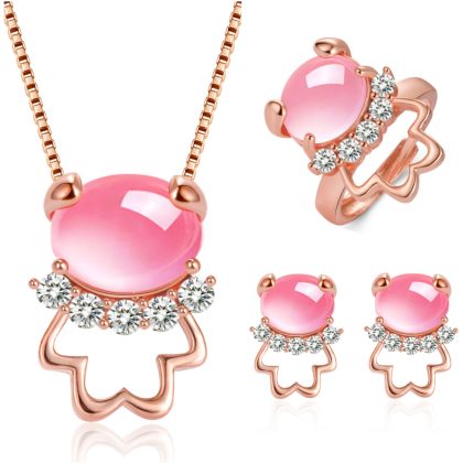 Pink Crystal Bear Bear holding ring pendant necklace suit imitation hibiscus stone high-grade cartoon bear head accessories
