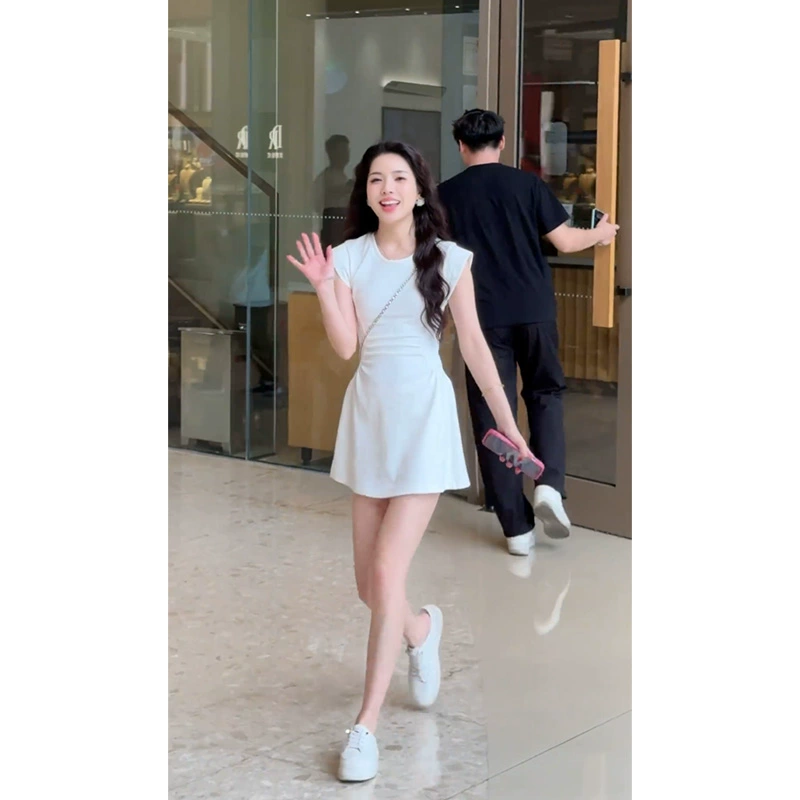 Pleated fly sleeves round neck summer slim dress