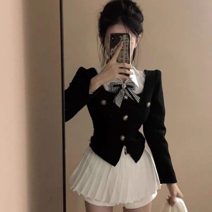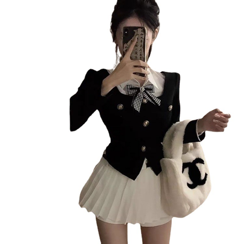 | nameOriginal | Pleated Skirt Two-piece Set High Waist Fake Two-piece Spice Girl Coat Top Autumn Chanel Style Plus Academy Style Women's New Style |