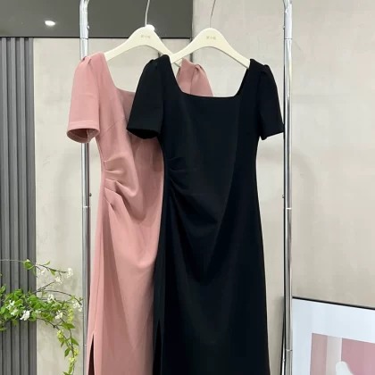 | nameOriginal | Pleated waist slit dress summer simple short sleeves |