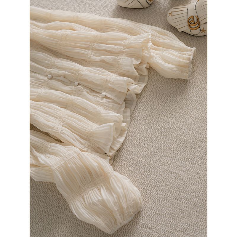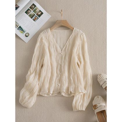 plus size 2024 New Unique Chic Top Super Good-looking Heavy Industry Shirt Light Apricot Pleated Shirt Women's Spring and Summer