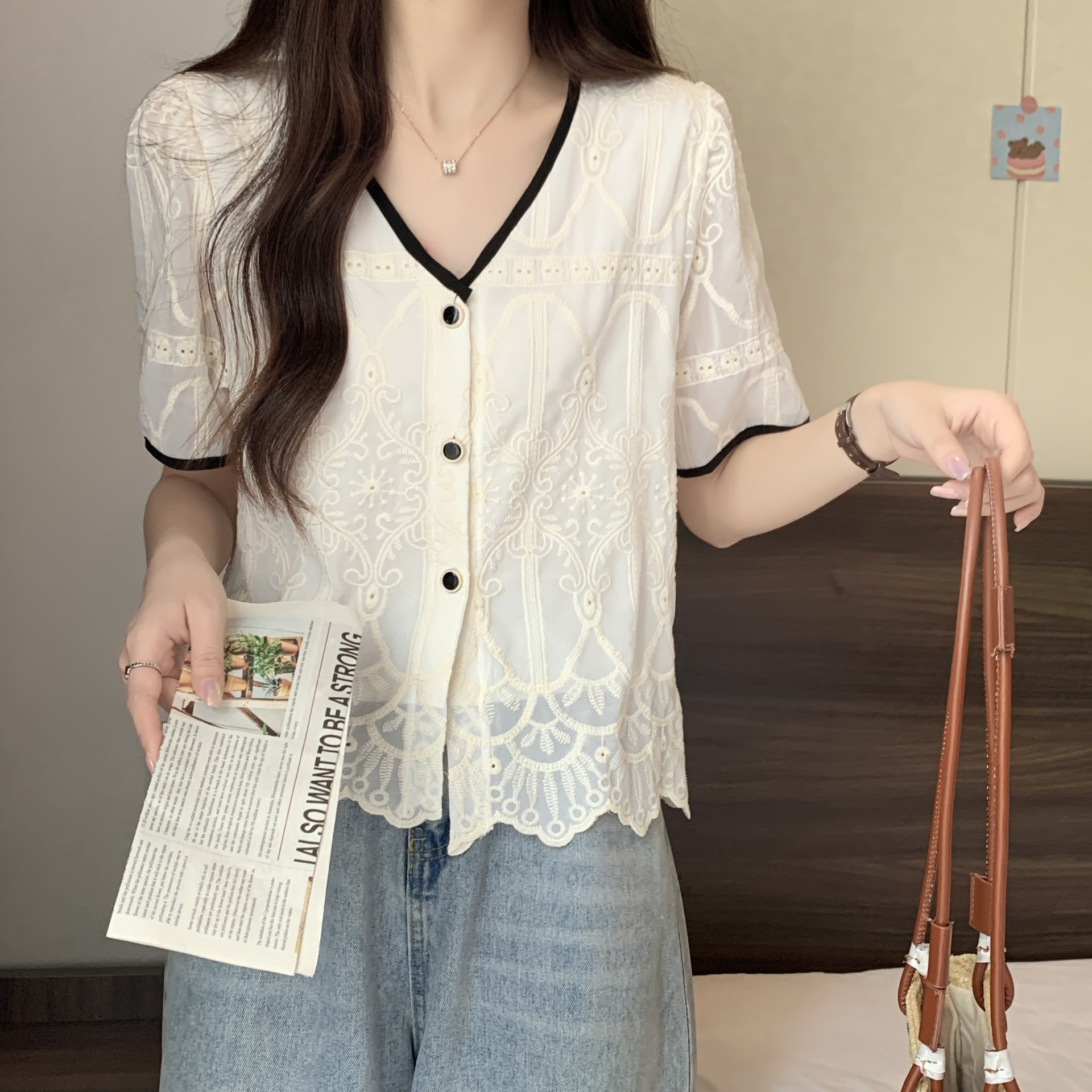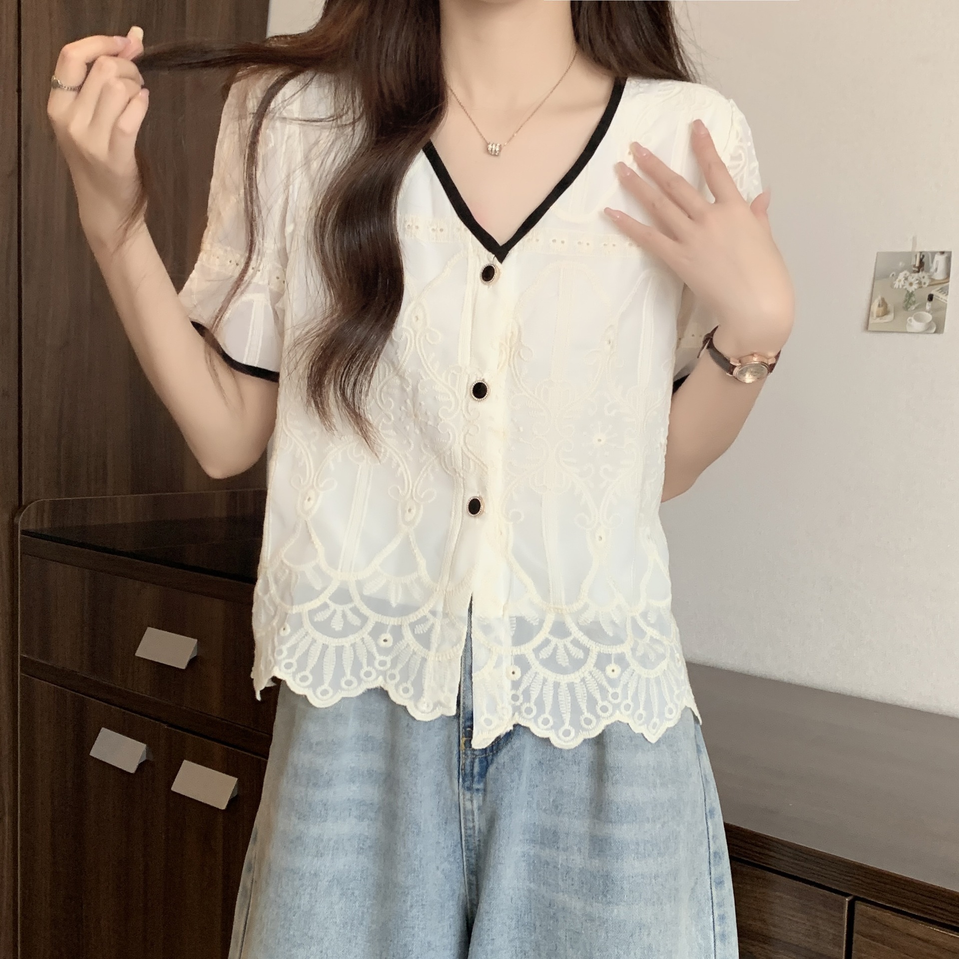 | nameOriginal | plus size Chanel Style V-neck Short-sleeved Shirt 2024 New Summer chubby girl Slimming Top Design Niche Female |