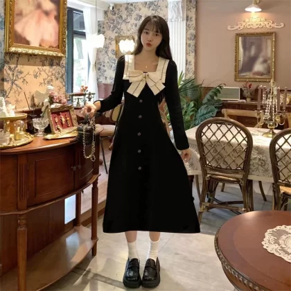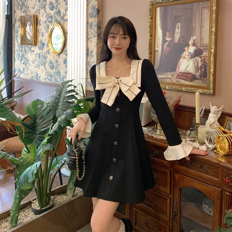 Plus size Hepburn style square neck bow dress for women in autumn black retro skirt for fat mm that covers the flesh and looks slimming long skirt