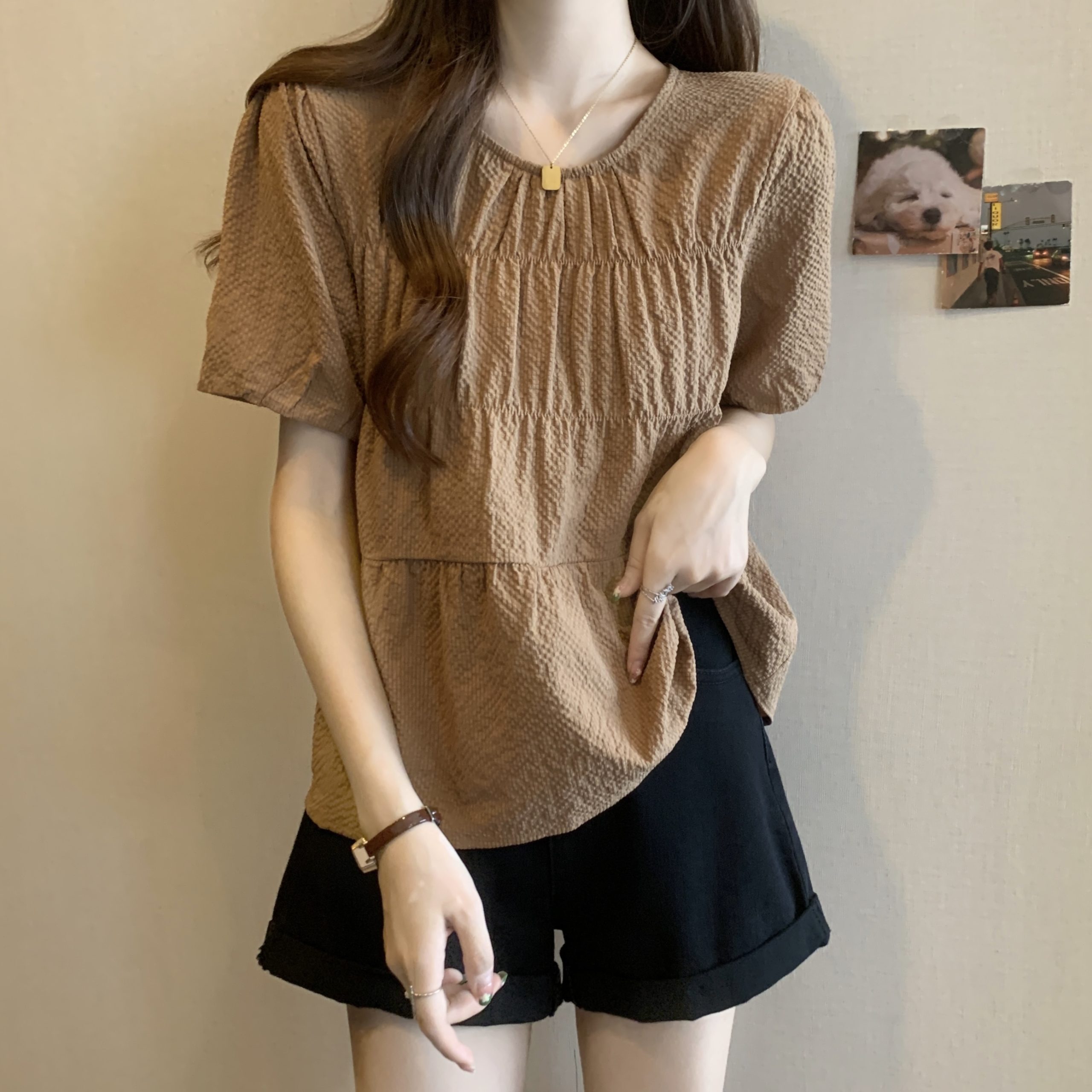 | nameOriginal | plus size Shoulder Chiffon Short-sleeved T-shirt Women's Summer chubby girl Slimming Loose Belly Covering Design Pleated Age-reducing Top |
