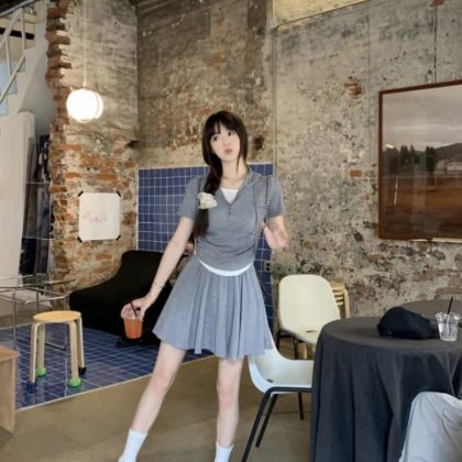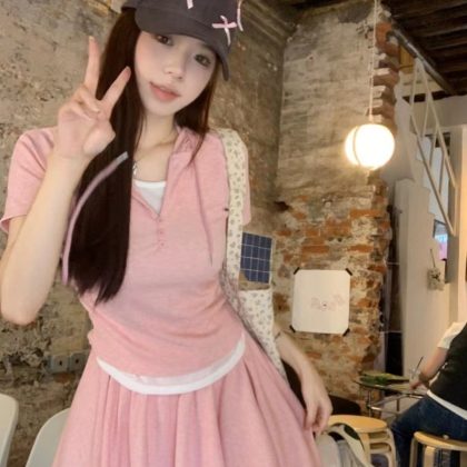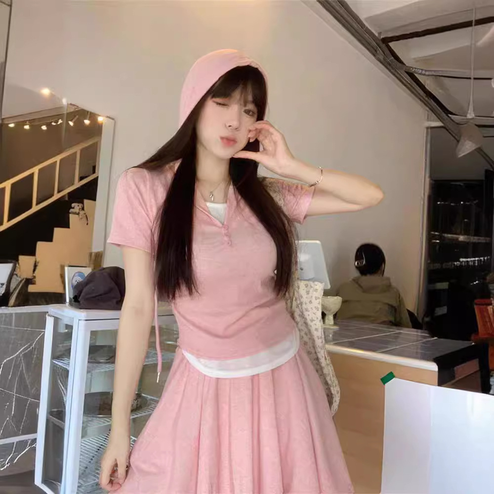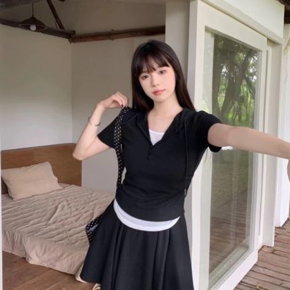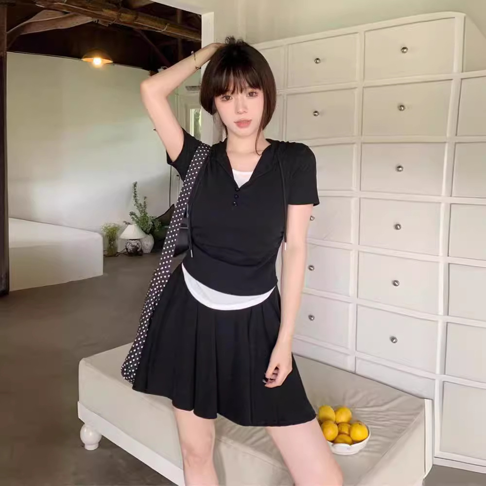 plus size Sports Casual suit Women's Summer chubby girl Slimming Hooded Top High Waist Pleated Half-length Skirt Two-piece Set
