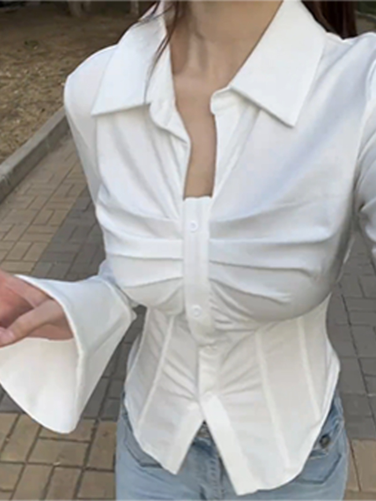 Plus size waist-tight inner top women's spring chubby girl slimming pure waist-tight flared sleeve V-neck twisted Fishbone shirt