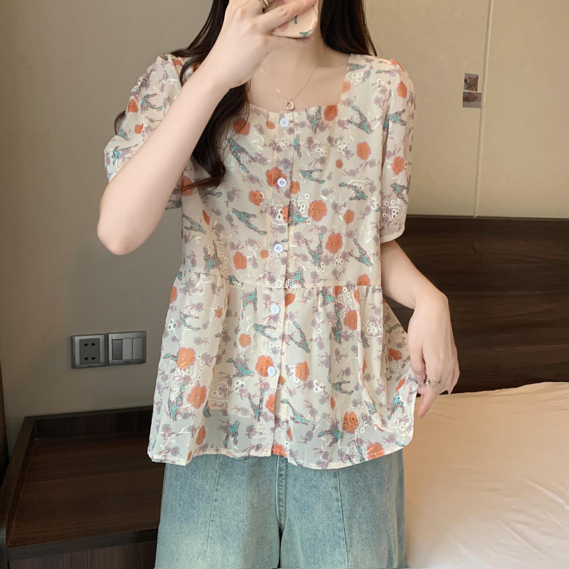 | nameOriginal | plus size Women's 2024 Summer New Slimming Square Collar Floral Chiffon Shirt for Chubby Girls Loose Belly Covering Short Sleeve Top Zb |