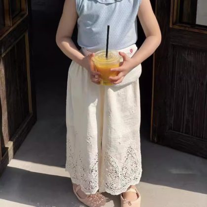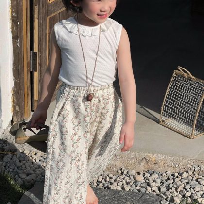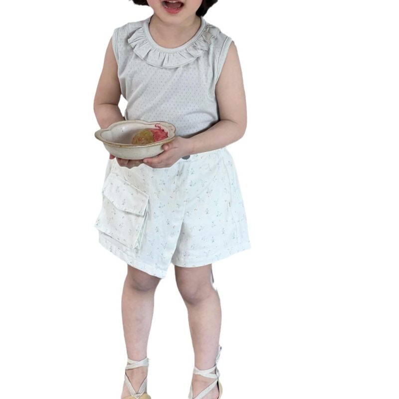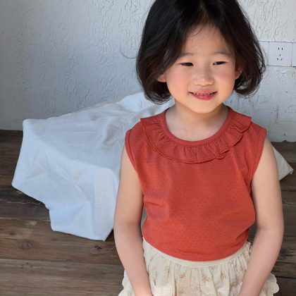 مدببة البيض الكورية نمط ملابس أطفال 2024 الصيف نمط جديد الفتيات سترة بلا أكمام بلون الأذن الرقبة لطيف