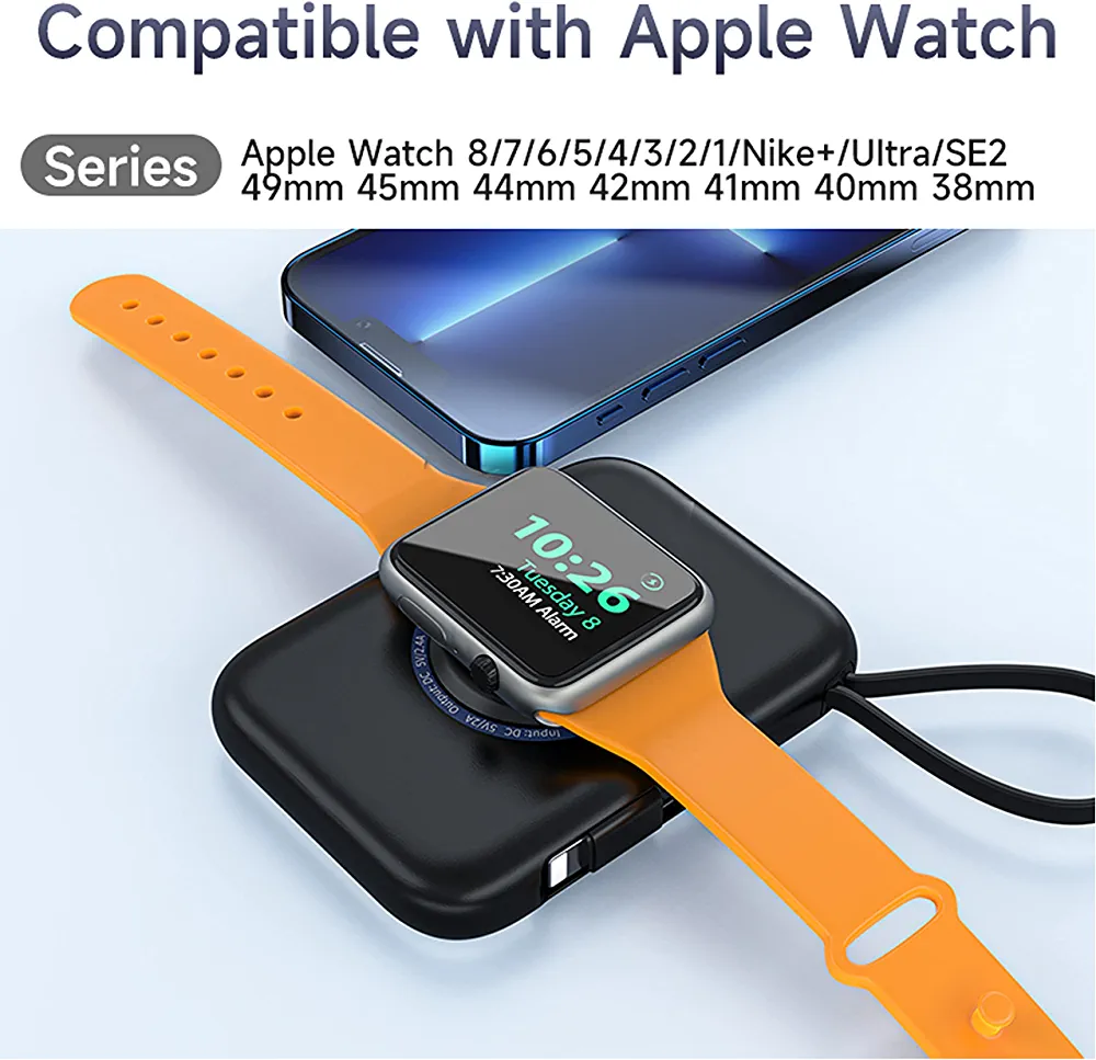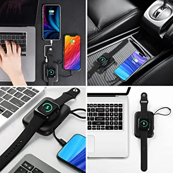 هذا المنتج عبارة عن شاحن صغير ومحمول يمكن وضعه بسهولة في جيبك أو حقيبتك بسبب شكل الحبل. يحتوي على بنك طاقة ذو سعة كبيرة مثالي للسفر ويأتي مع وحدة شحن مغناطيسية تسمح لك بشحن هاتفك والمشاهدة في أي وقت وفي أي مكان دون الحاجة إلى كابلات طويلة أو قواعد ضخمة. يحتوي الشاحن على وحدة امتصاص مغناطيسية مدمجة تقوم بشحن Apple Watch فورًا عند الاتصال، وتوفر بطارية 5000 مللي أمبير عمرًا إضافيًا للبطارية. إنه متوافق مع جميع سلاسل Apple Watch ويمكنه شحن ما يصل إلى ثلاثة أجهزة في وقت واحد، بما في ذلك أجهزة iPhone و iPad و iPod. يحتوي الشاحن على مؤشرات LED ذكية تُظهر مستوى البطارية وتومض عند الشحن، وأربعة مصابيح LED صلبة عند الشحن الكامل. بالإضافة إلى ذلك، فهي تتمتع بتقنية رائعة تسمح لها بشحن نفسها أثناء تشغيل الأجهزة الأخرى.