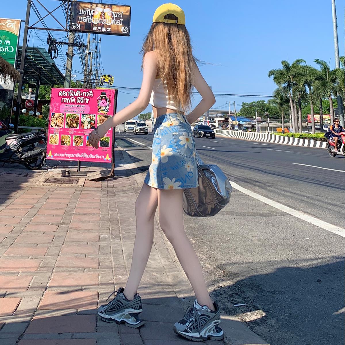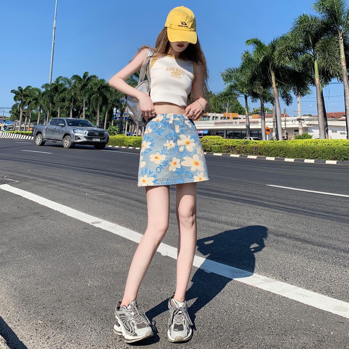 | nameOriginal | Printed Denim Short Skirt 2024 Summer New High Waist Slim A- line Anti-walking Hip Skirt Loose 4-point Skirt |