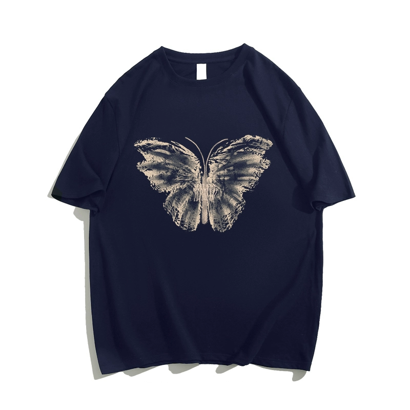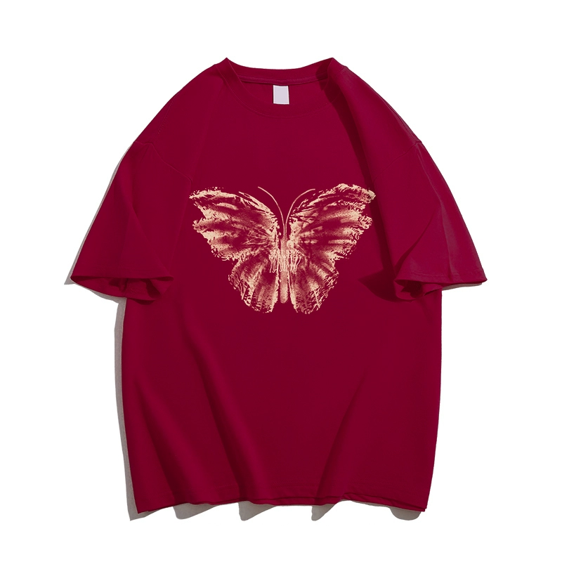 Pure cotton design T-shirt for women with butterfly print large size short-sleeved oversize American retro couple top trendy ins
