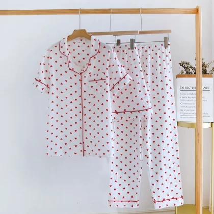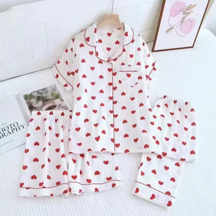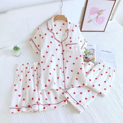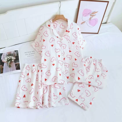 Pure cotton gauze sweet love pajamas women's short-sleeved trousers shorts casual spring and autumn crepe three-piece home clothes