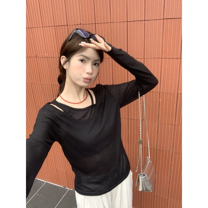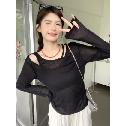 | nameOriginal | ~ Pure desire for wind fake two irregular shirt women's summer hot girl shoulder-length slim long sleeve sunscreen top |