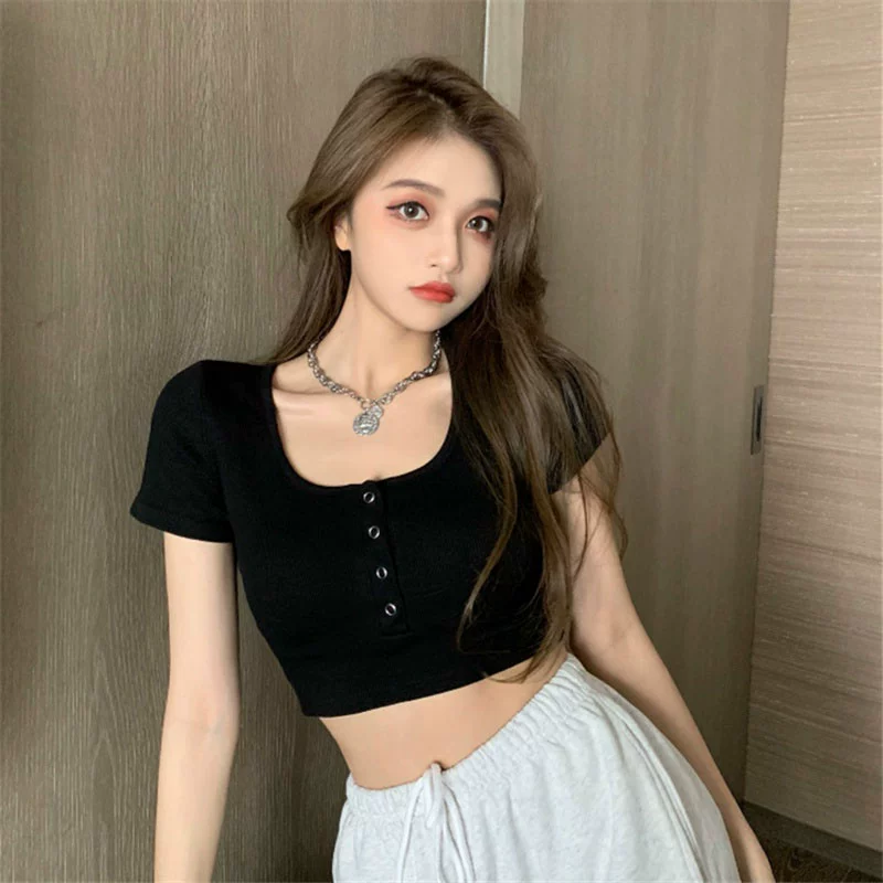 | nameOriginal | Pure Desire Hot Girl Button Short Sleeve T-Shirt Women's Summer Design Niche Slim High Waist Short Navel Top  |
