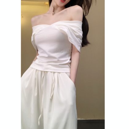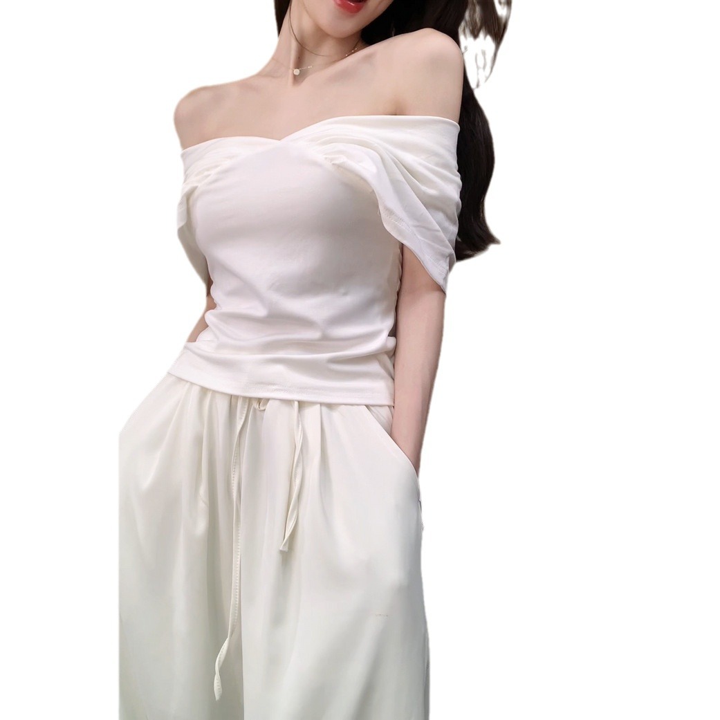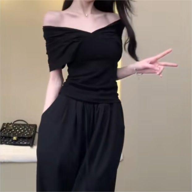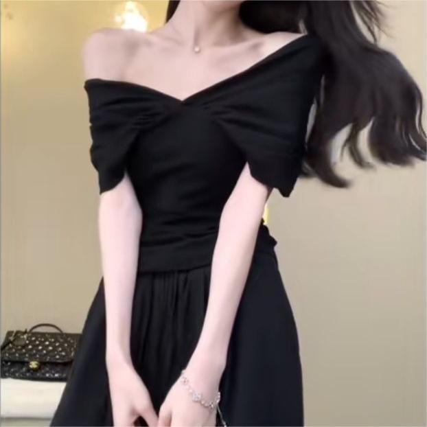 | nameOriginal | Pure Desire Style off-shoulder Short-sleeved Women's Temperament Slim-fit Shoulder-exposed Design Sense Niche Sexy Clavicle Black Two-wear T-shirt |
