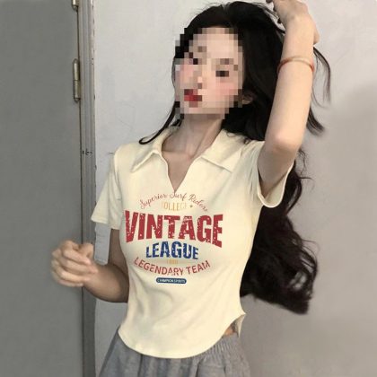 nameOriginal | Pure Spice Girl Slim-fit Top Design Sense 2024 New American Polo Shoulder Short-sleeved V-neck T-shirt Women's Summer |