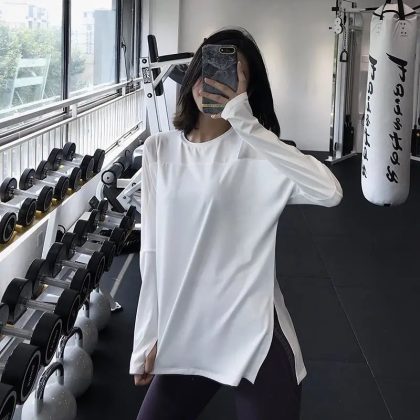 التجفيف السريع تي شيرت ملابس اليوغا عادية بأكمام طويلة ملابس رياضية علوية المرأة فضفاضة الجري التدريب صافي الأحمر التخسيس اللياقة البدنية تنفس