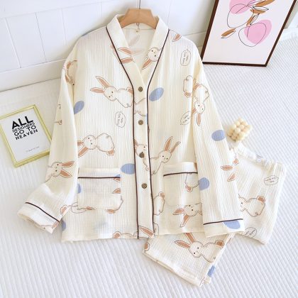 بدلة أرنب كريب برقبة على شكل حرف V للربيع والصيف بيجامة فضفاضة جديدة طية صدر السترة ملابس منزلية كاجوال مريحة جيل من الشعر
