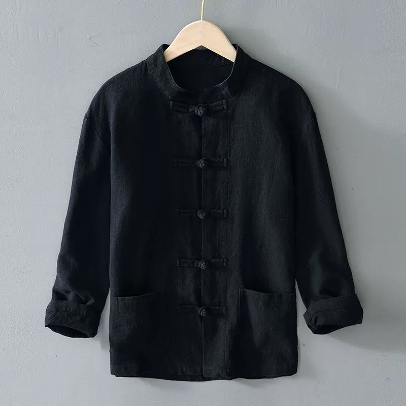 Ramie long sleeve Chinese style youth stand collar shirt with button