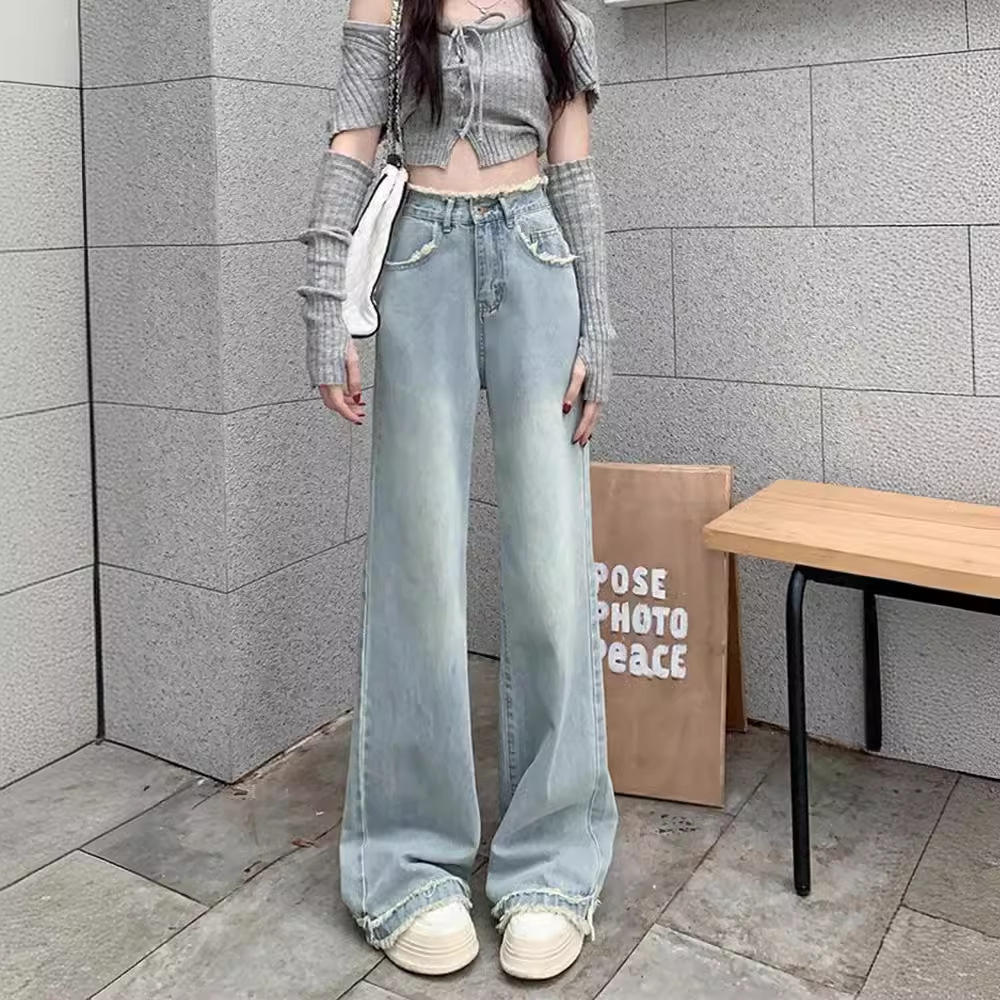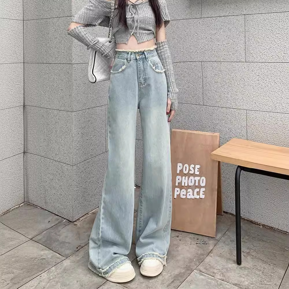 | nameOriginal | Rapped Design Light Blue Jeans Women's Autumn 2024 New Retro High Waist Slimming Wide Leg Straight Pants |
