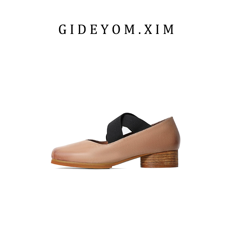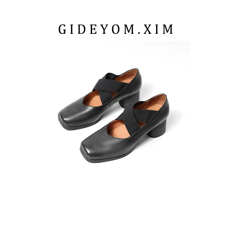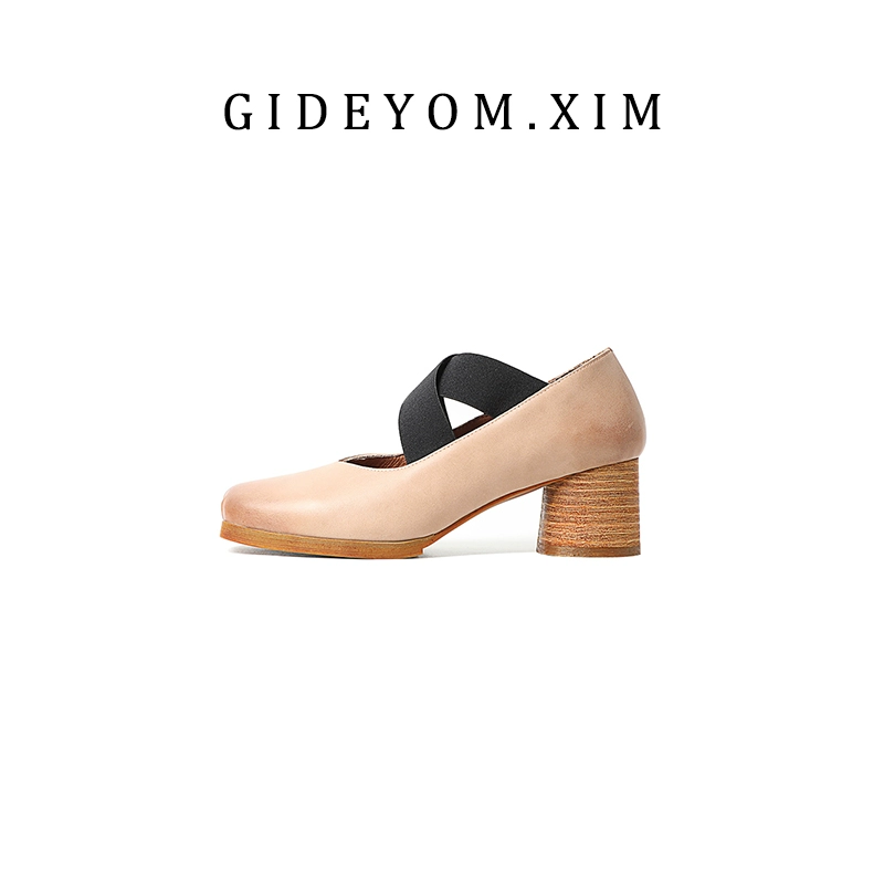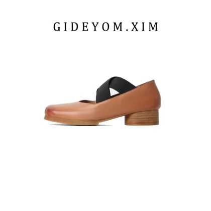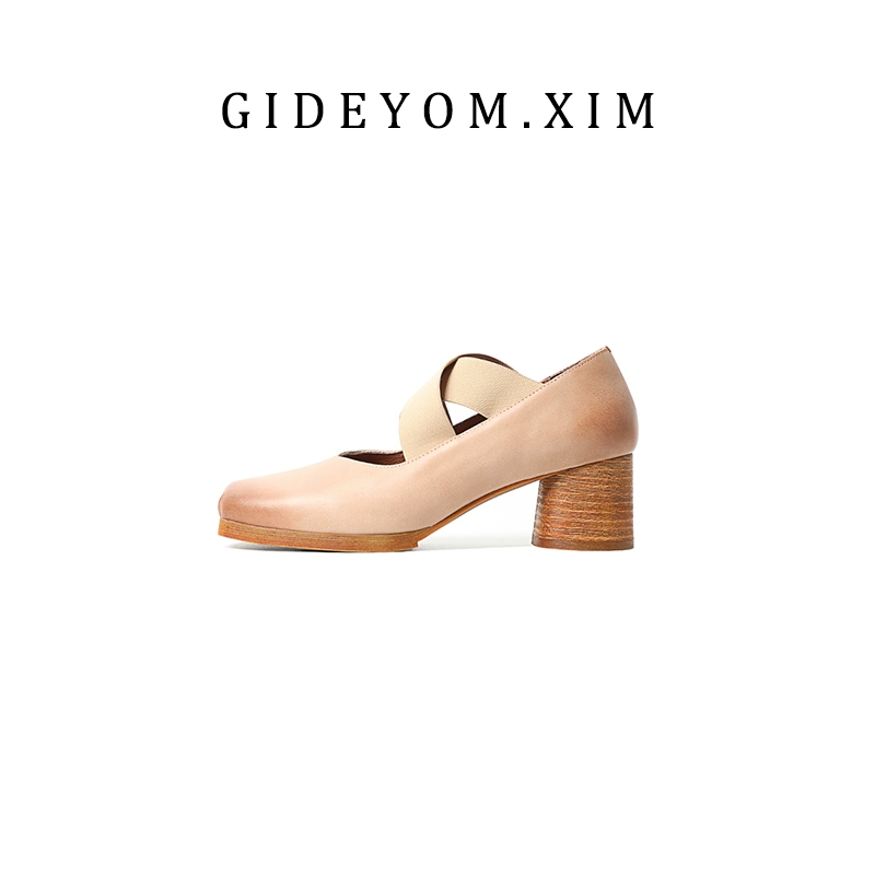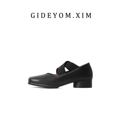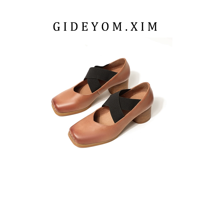 أحذية باليه كلاسيكية مصنوعة يدويًا من الجلد برأس مربع وأنف الخنزير وكعب سميك أحذية نسائية ترتدي أشرطة في الأشرطة، أحذية Maryzhen