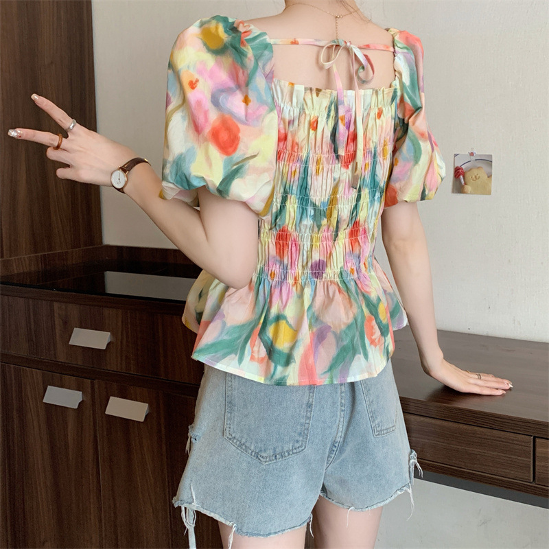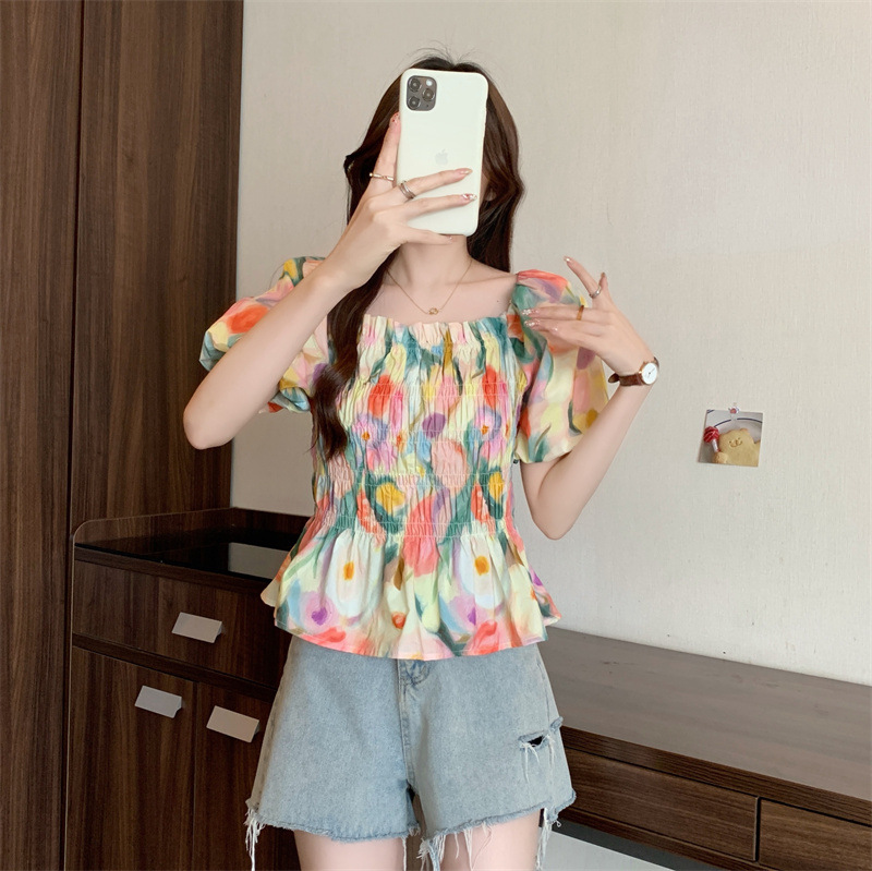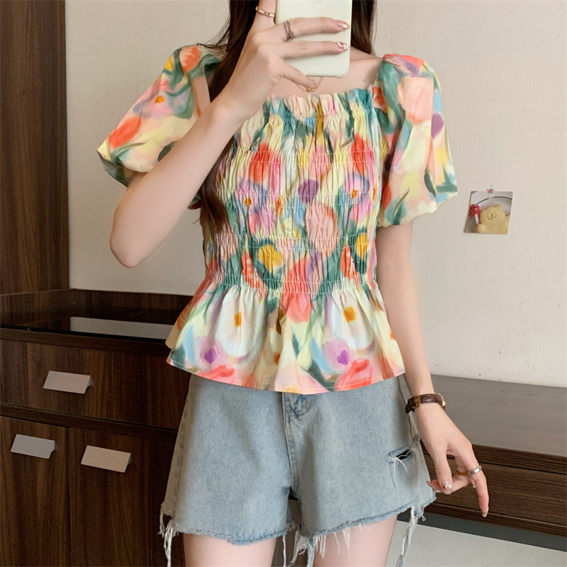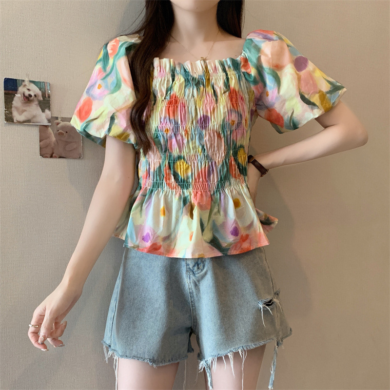 nameOriginal | Real shot 2024 plus size women's in stock square collar pleated waist slimming printed short sleeve shirt floral shirt women's summer |