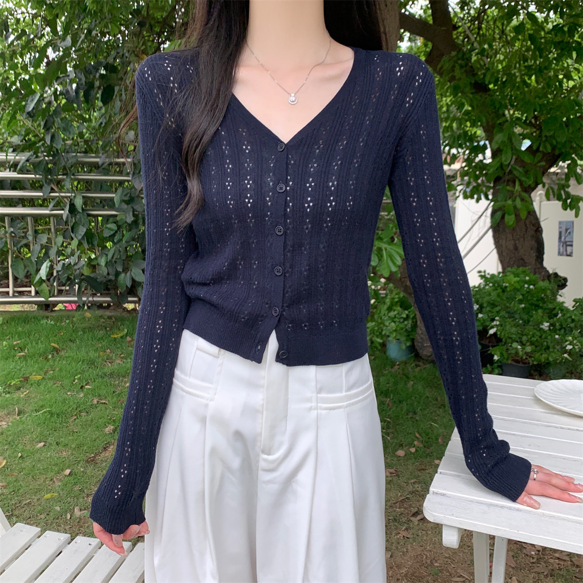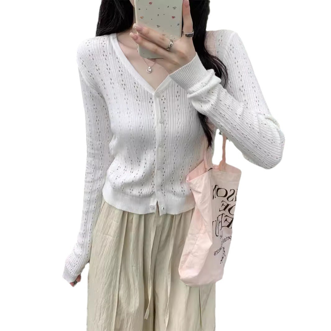 Real Shot 2024 Summer Korean Style Bm Slim Fit V-Neck Hollow Elegant Thin Sunscreen Knitted Cardigan Top