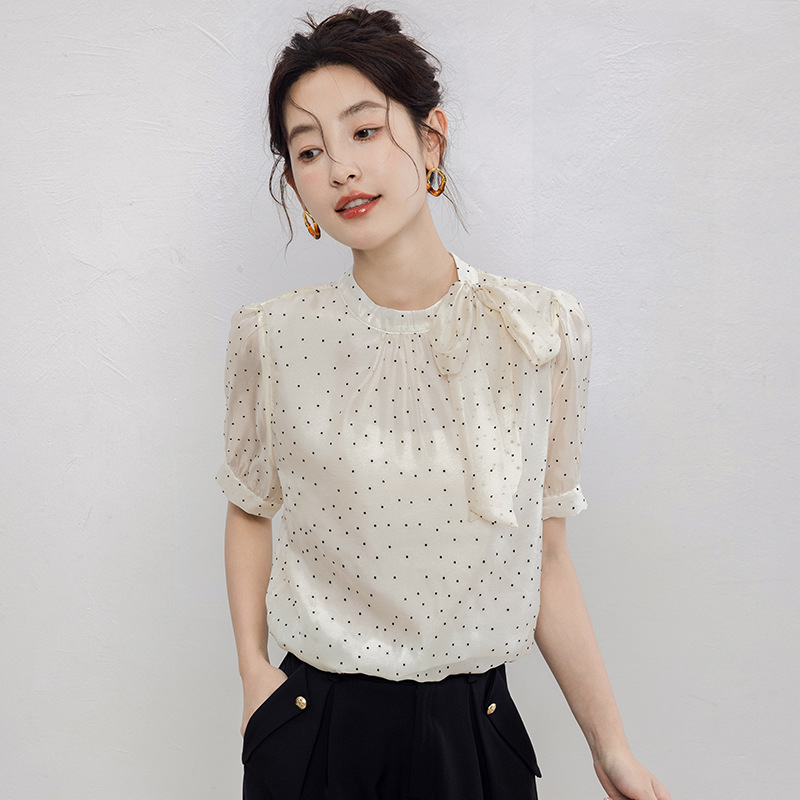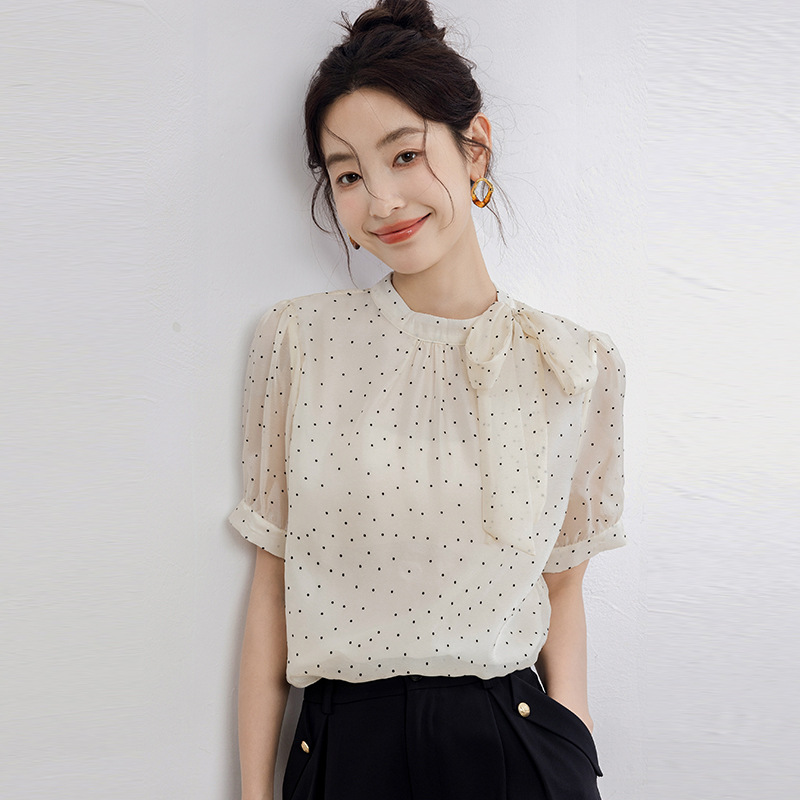 | nameOriginal | Real shot 2024 summer new small fresh sweet lady half high collar short sleeve wave dot chiffon top |