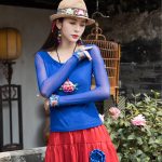 Real Shot Ethnic Style Mesh Stitching Cuff Embroidered Design All-match Round Neck Base Large Size Women