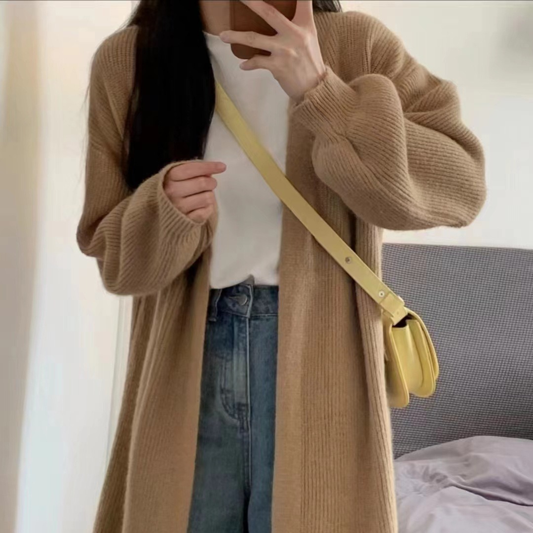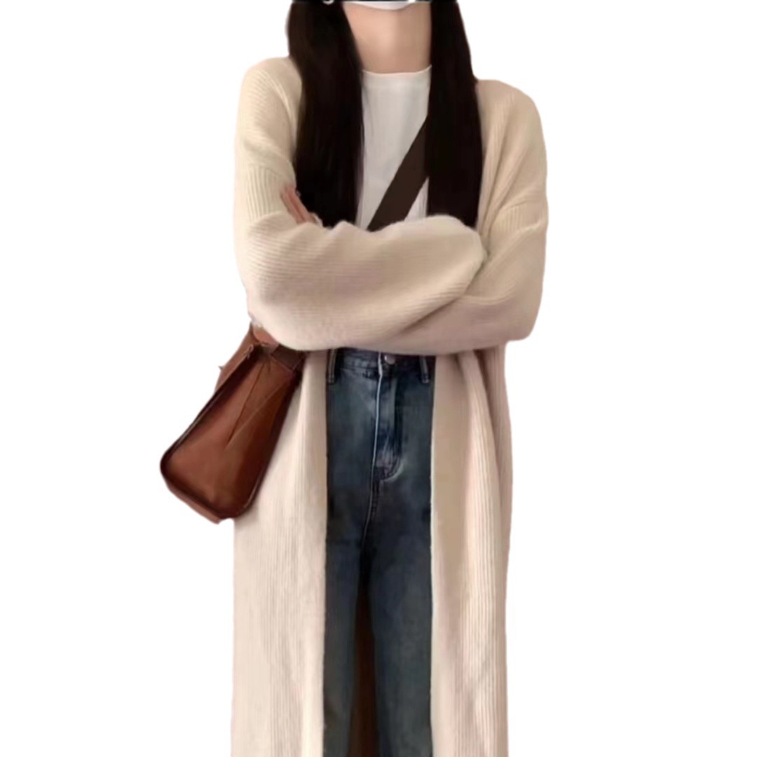 Real shot knitted long solid color lazy style V-neck buckle-free cardigan sweater women's loose stitching autumn and winter coat women