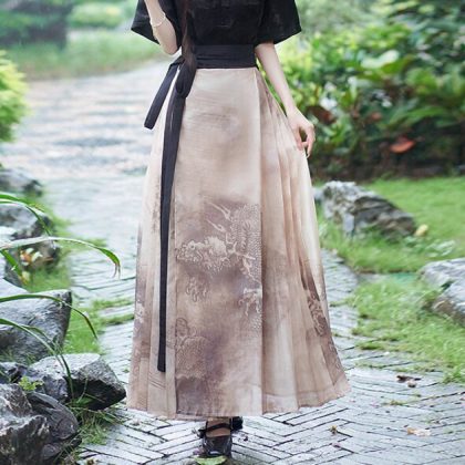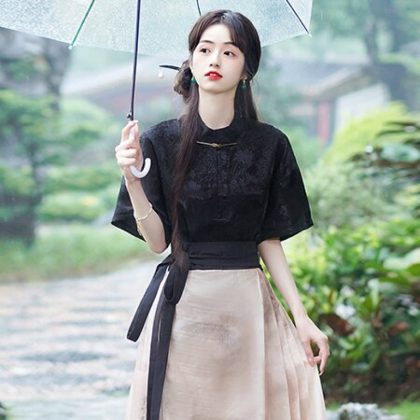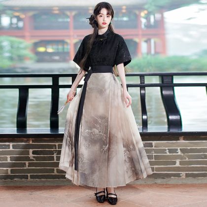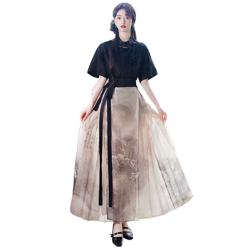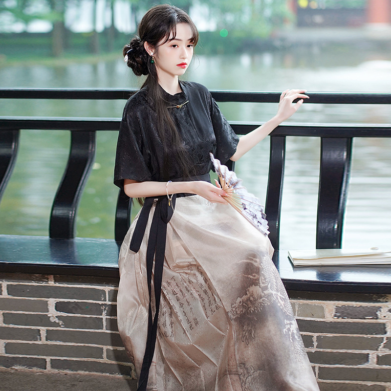 | nameOriginal | Real shot new Chinese jacquard buckle stand collar half sleeve short sleeve Chinese clothing with shirt drag cool ink printing and dyeing horse face skirt |