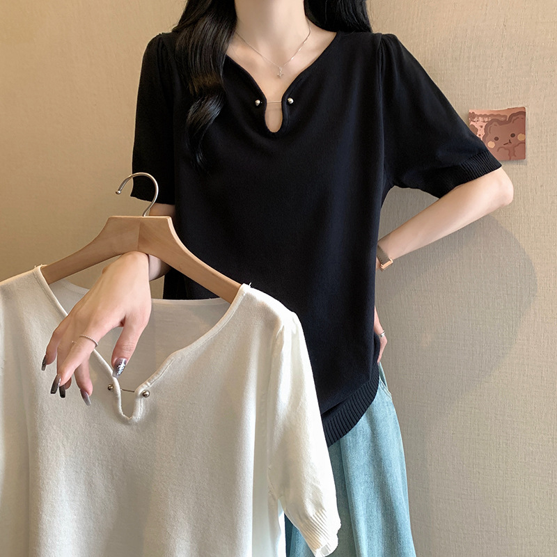| nameOriginal | Real Shot plus size 2024 Summer New Loose All-match Half-open Collar Ice Silk Short Sleeve chubby girl Simple Knitted Shirt Top |