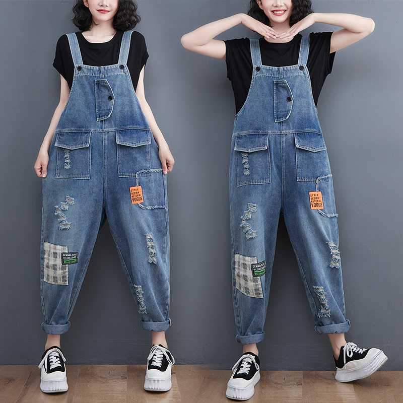 Real shot plus size Denim suspenders spring and summer 2024 new Korean version of loose casual fashion cloth embroidered suspenders