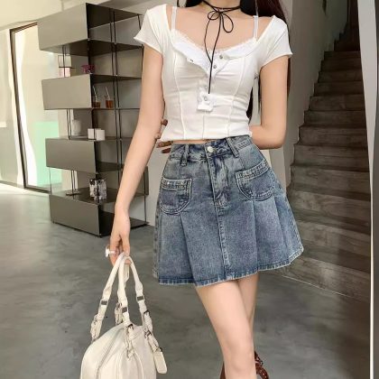 | nameOriginal | Real shot real price American Denim pleated skirt women's spring and summer 2024 new design high waist A- line skirt |