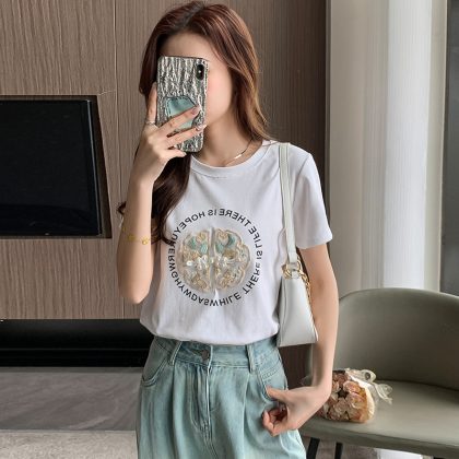 Real shot retro embroidered small short-sleeved T-shirt for women 2024 Summer new national style design niche top small shirt