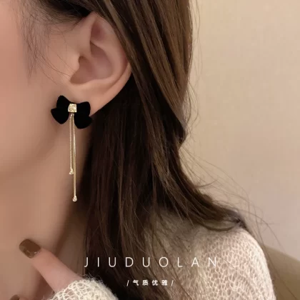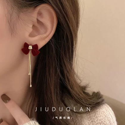 Red bow pearl tassel earrings for women, high-end long New Year festive earrings, slimming New Year earrings