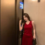 | nameOriginal | Red knitted casual long skirt two-piece suspender set |