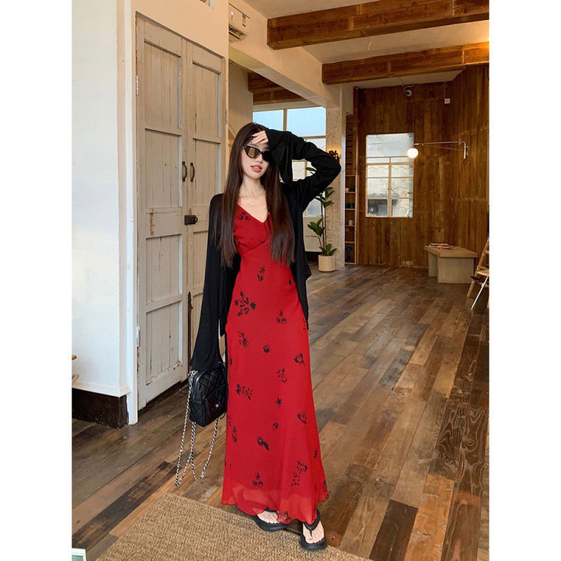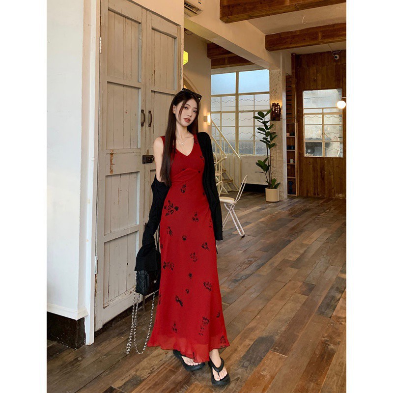 | nameOriginal | Red Romantic Floral Collar Vest dress Women's Summer New Dape Fashionable Tight Waist Slimming Niche Long Dress |